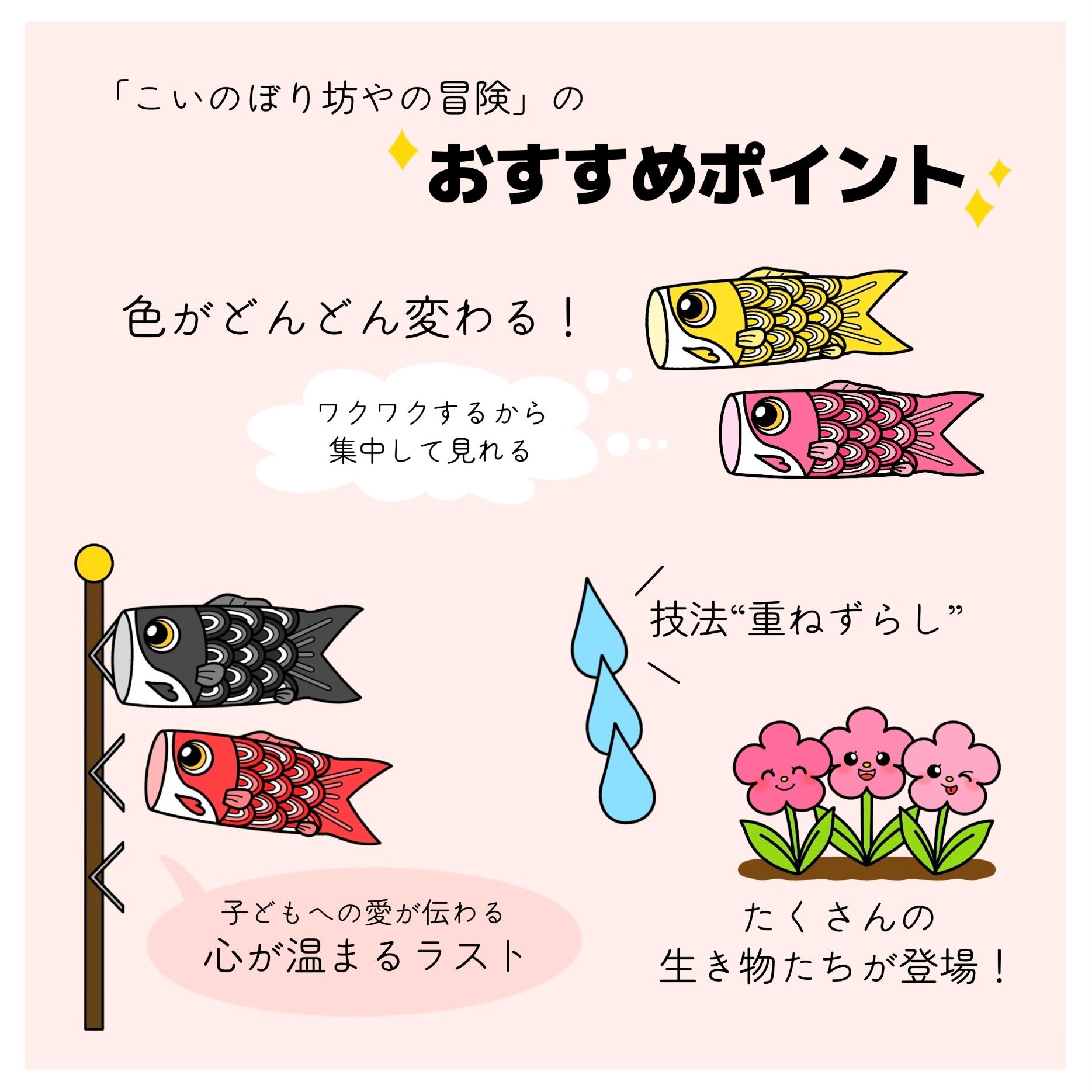 お父さんとお母さんと空を泳いでいたこいのぼり坊や。すると強い風がふき、飛ばされてしまいました!飛ばされた先で、様々な生き物に色を分けてもらい、素敵な色に変化していきます。楽しく冒険していたこいのぼり坊やでしたが、お父さん・お母さんに会いたくなり、涙が…